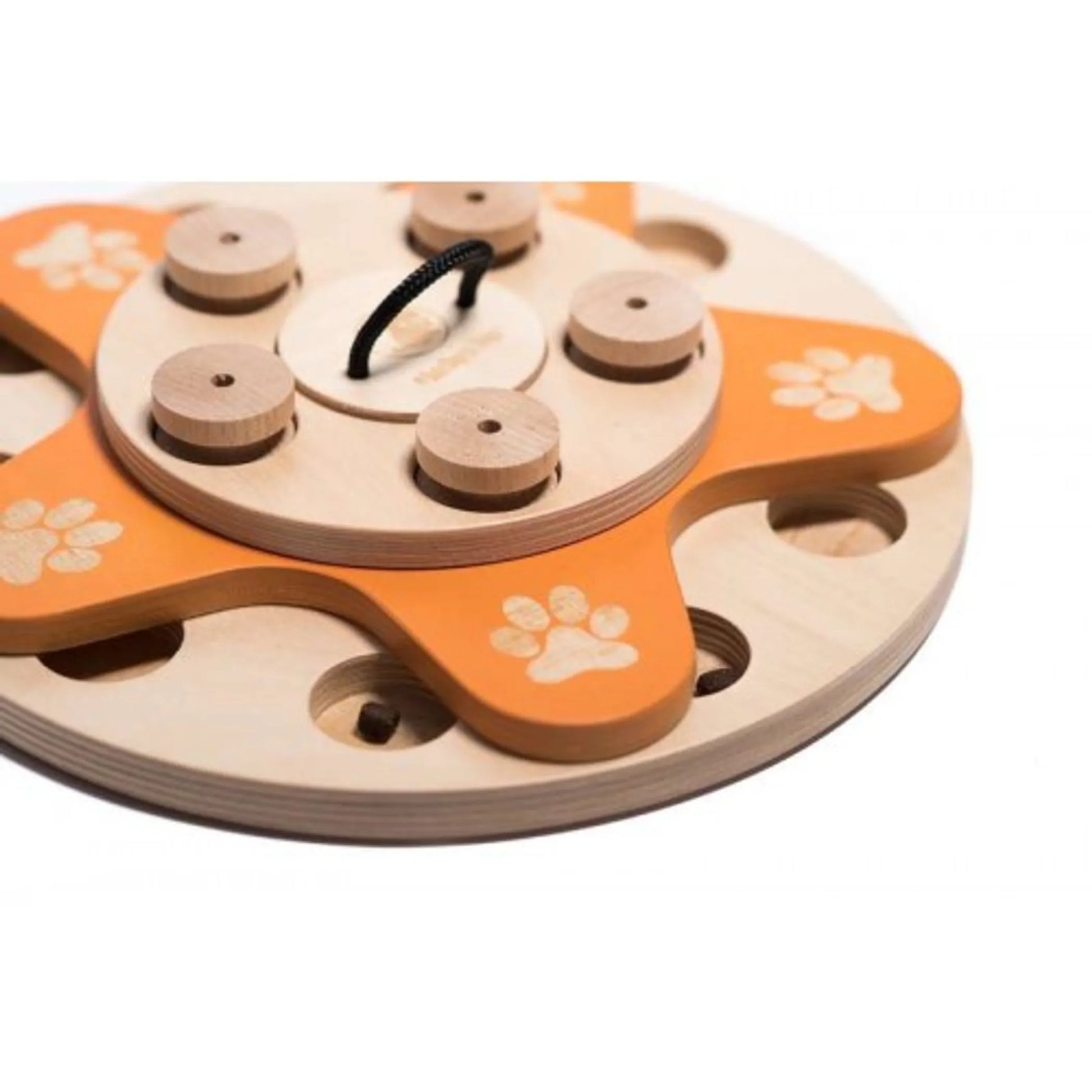 Length: 11.00 Width: 11.00 Height: 1.00 Dog's Flower Dog's flower is our other design in disk-shaped puzzles line, that aims to raise curiosity of your pet with circular object . Ten cylinders placed inside of two levels of wooden platforms require first removal of them from their designated spaces. Then the dog needs to spin flower-shaped platform in order to get to more treats awaiting him underneath. As with Birthday Cake puzzle, the parent can regulate the difficulty level from 1 paw to 4 paws by adding or subtracting the cylinders. May this "flower" brighten every day of your dog's life! According to dog's behaviorists 10 minutes of mental stimulation with employment of interactive game equivalents to 1 hour of physical exercise. This is especially important for the dogs living in large cities where long walks are difficult and impossible , senior dogs with ailments that do not allow them for prolong outings and those living in cold climates where going outside can put animal's health at risk. Additional information: Dimensions: 15"x13"x3" Weight: 3lb All our games and puzzles are made from certified wood covered with water-based varnish that is not harmful to humans and animals. Please keep the game dry and free of water exposure, as the wooden pieces may swell otherwise. Use only dry treats for playing with our games Keep out of reach of small children since removable parts can be a choking hazard to them.